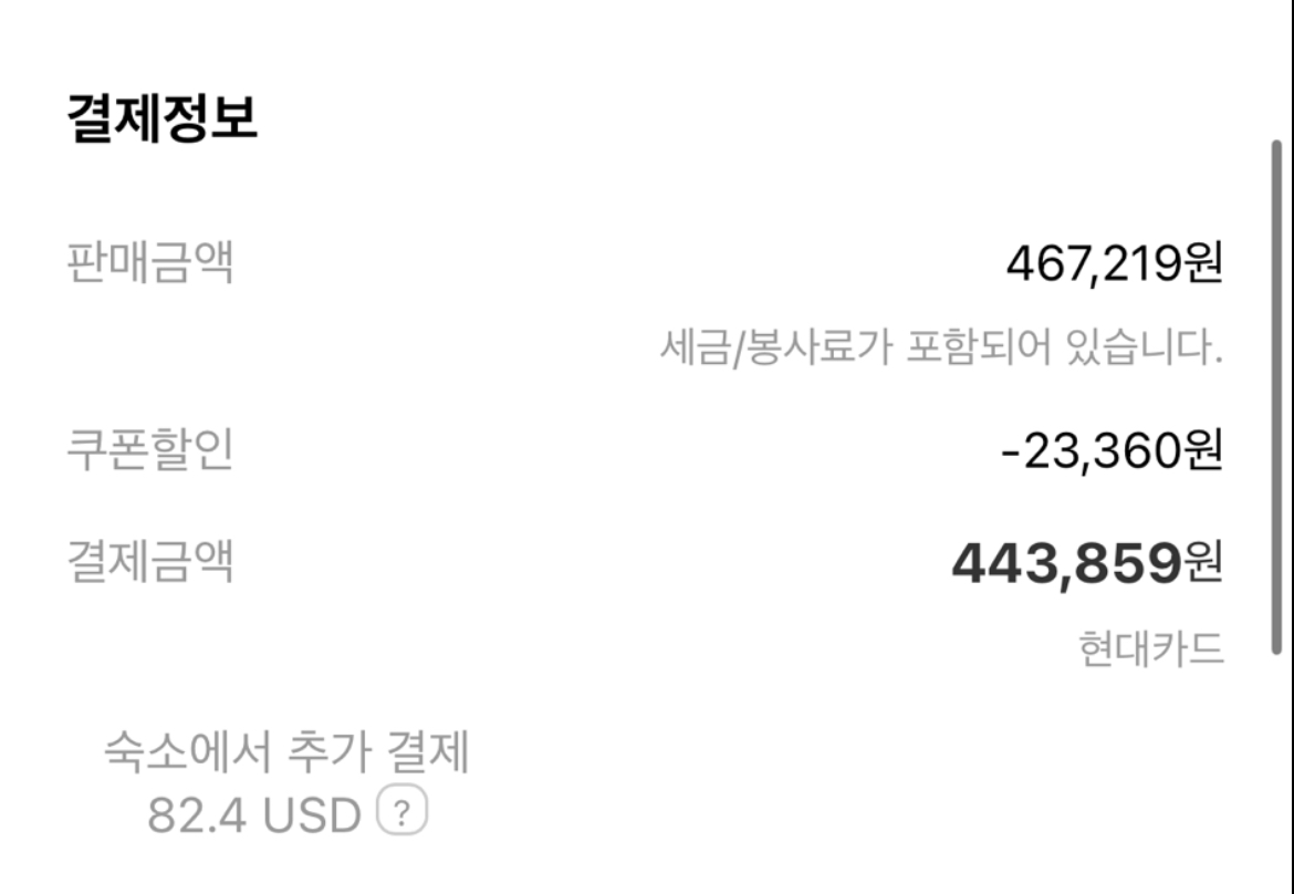 숙소에서 추가 결제하게 되는 금액으로 82.4 달러 (한화 대략 12만원) 가 추가된다.
