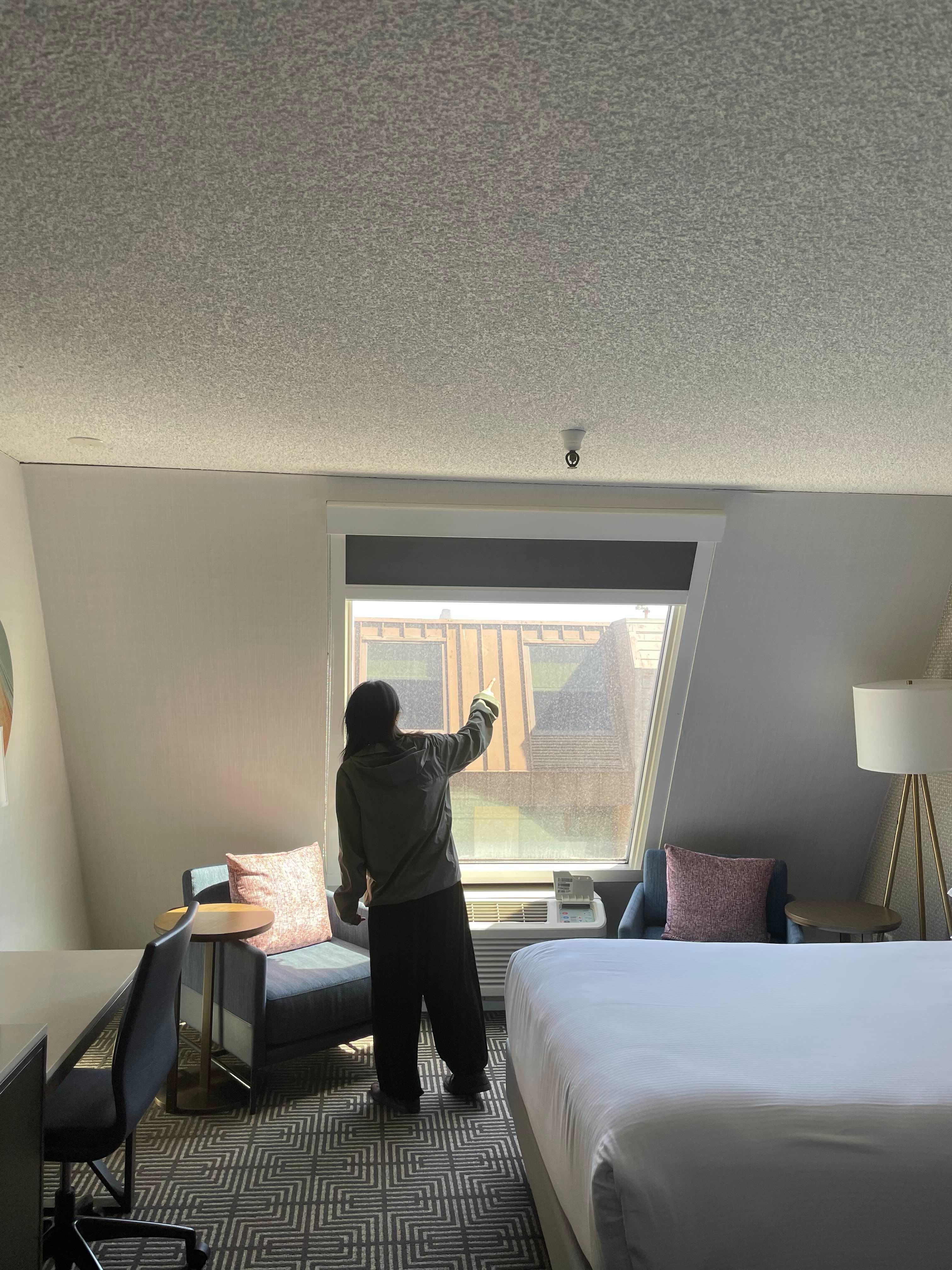 방에는 열리지 않는 창이 하나 있었는데, 아쉽게도 얼룩으로 많이 지저분했다.