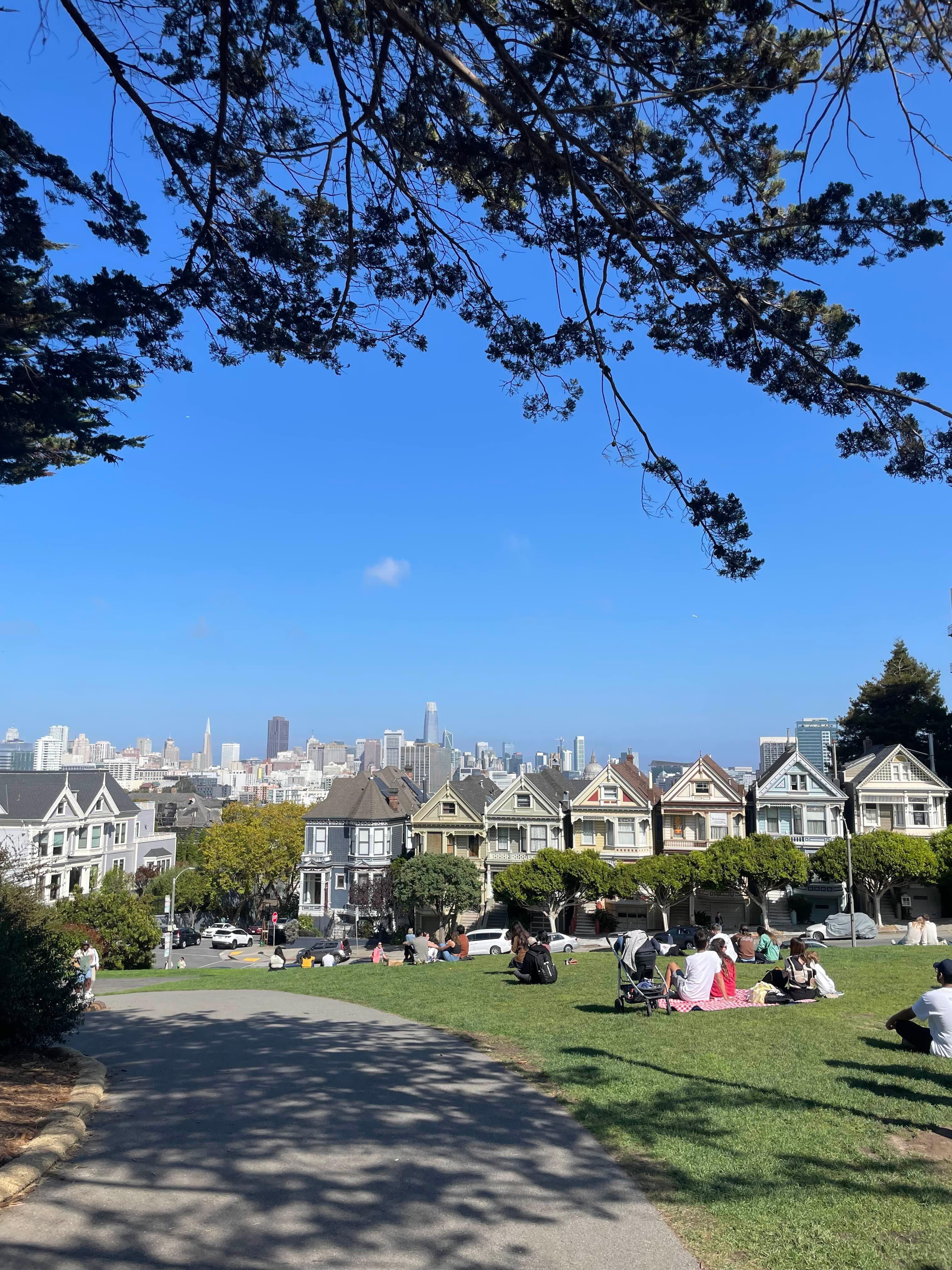 잔디에 앉아 더 페인티드 레이디스 쪽을 바라보면 뒤로 고층 빌딩이 즐비한 샌프란시스코 스카이라인이 함께 보인다.